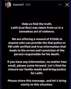 Zij voormalige geliefde heeft zaterdag via sociale media bekend gemaakt dat deskundigen hebben vastgesteld dat Leo is vermoord.