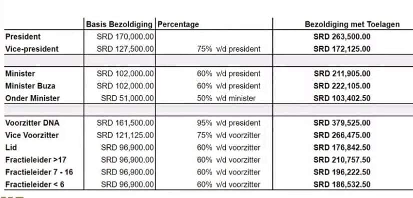 De president zal een salarisverhoging ontvangen van SRD 170.000 naar SRD 263.500 inclusief toelagen.