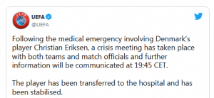 De UEFA heeft op Twitter laten weten dat zijn toestand nu stabiel is.