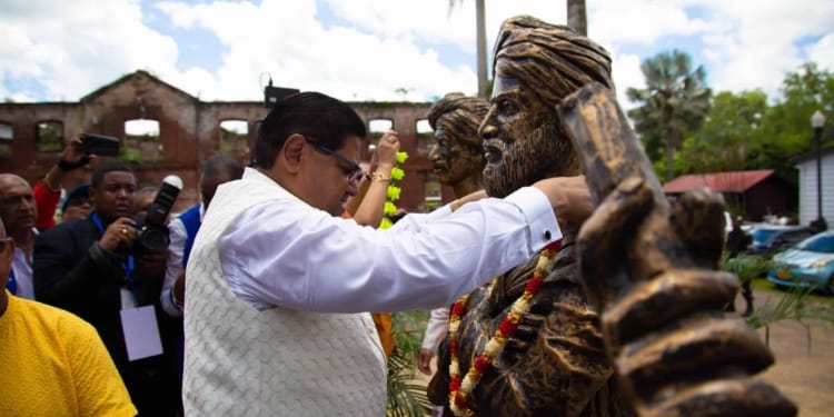 Het monument dat de beelden van dit drietal voorstelt, is op 5 juni in het kader van de viering van 150 jaar Hindoestaanse Immigratie in Suriname onthuld.