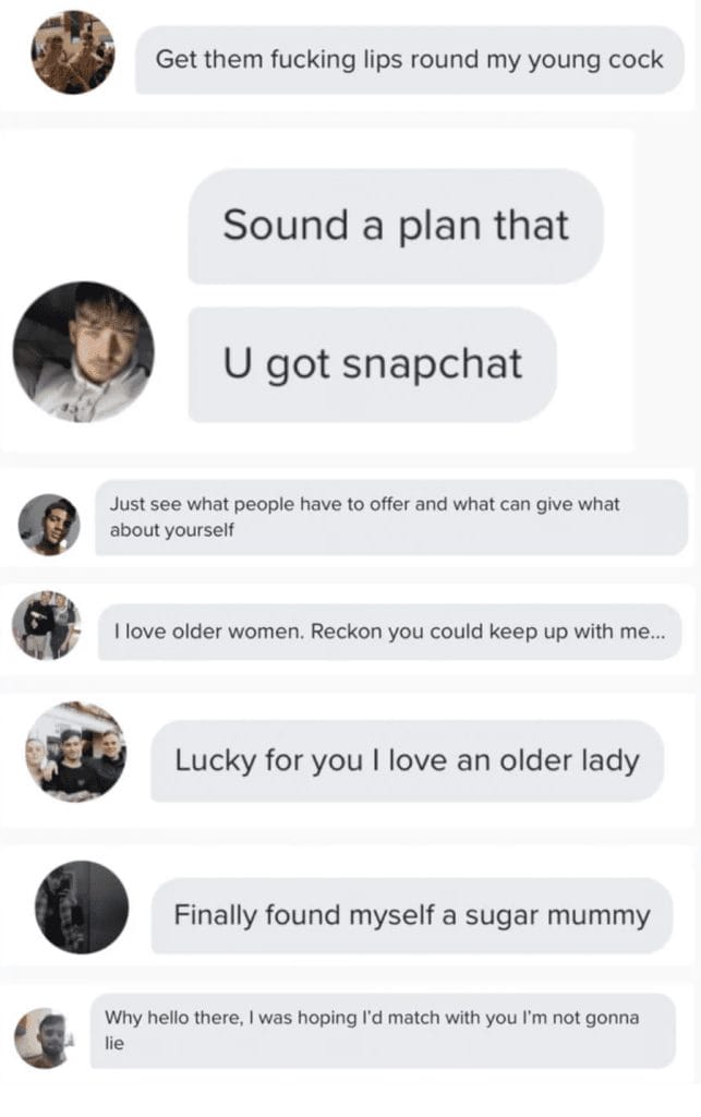 GFC LIFESTYLEREDACTIE- Een 64-jarige senior wordt op datingapp Tinder overspoelt met aandacht van voornamelijk jonge heren die graag een beschuitje met haar willen eten. Onderaan staan de gesprekken.