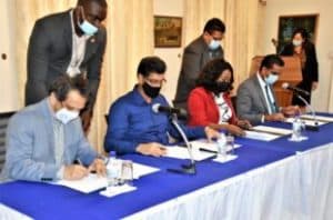 Het document is ondertekend door minister Amar Ramadhin van Volksgezondheid, directeur Manodj Hindori van het St. Vincentius Ziekenhuis, directeur Claudia Redan van het Academisch Ziekenhuis Paramaribo en Pranobe Oemrawsing van het Diaspora Medisch Team.