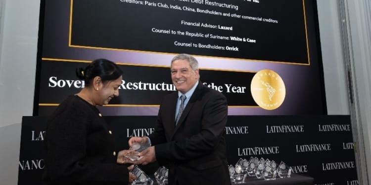 Suriname is door LatinFinance bekroond met de prestigieuze “Sovereign Restructuring of the Year” award voor de succesvolle herschikking van $1,5 miljard aan staatsschuld.