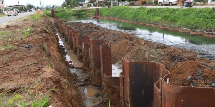 GFC NIEUWSREDACTIE- De werkzaamheden voor het plaatsen van stalen damwanden langs de Guarani- en Amazonestraat in het ressort Munder (Suriname) is in volle gang.