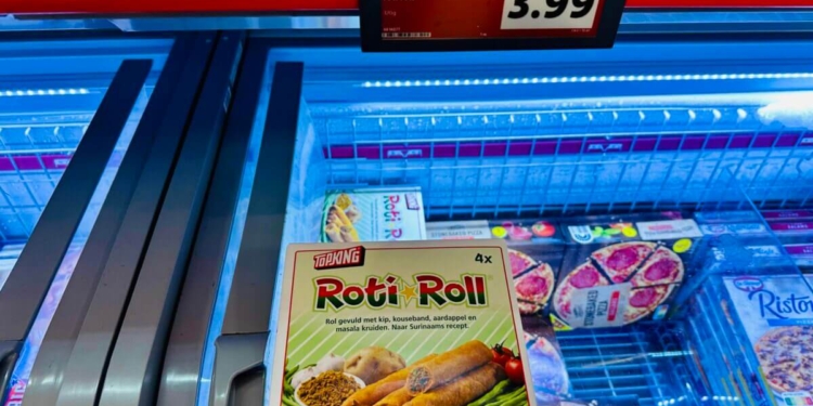 De Roti Rol bestaat uit vier rolletjes van in totaal 320 gram en kost €3,99. Volgens het etiket is de vulling gemaakt van kip, kouseband, aardappel en masalakruiden, “naar Surinaams recept”.
