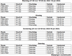 GFC NIEUWSREDACTIE- In de periode 21 november – 5 januari 2023 zal het regionaal vliegschema van Surinam Airways worden aangepast met extra vluchten op de route Paramaribo – Georgetown – Miami v.v. (PBM-GEO-MIA).